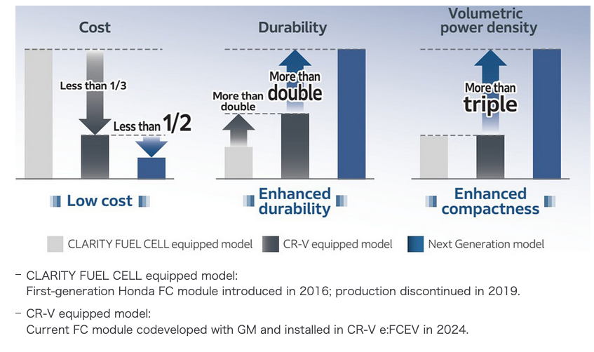 The Honda Next Generation Fuel Cell Module is being independently developed by Honda as a successor to the current model Honda co-developed with General Motors (GM). In addition to achieving a rated output of 150kW, the fuel cell module is stated to lower production costs by 50% and double durability. Most impressively, Honda is claiming a threefold increase in volumetric power density.