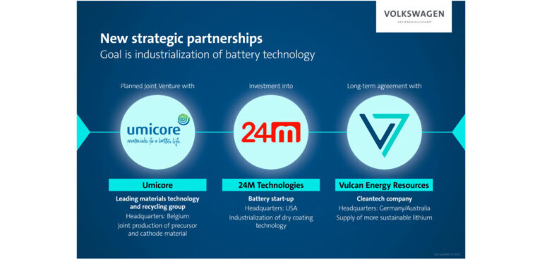 The Volkswagen Group has entered three strategic partnerships, which it states further strengthen its position in the field of battery supply and manufacture. Its new partners are materials technology group Umicore, battery specialist 24M Technologies and cleantech company Vulcan Energy Resources.