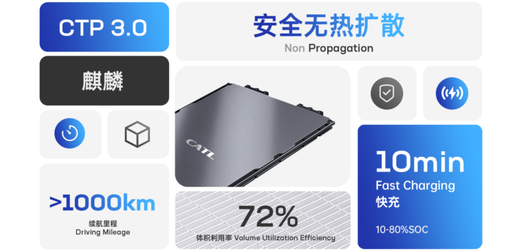 The Qilin batteries are based on CATL’s third-generation CTP technology. With a volume utilization efficiency of 72% and an energy density of up to 255Wh/kg, they are claimed to be capable of delivering a range of over 1,000km. Moreover, by adopting large-surface cell cooling technology, CATL states that Qilin supports a hot start in five minutes and fast charging in 10 minutes. With the same chemical system and pack size, it can deliver 13% more power than a 4680 battery.