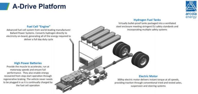 Arcola’s A-Drive technology platform is a production-ready hydrogen fuel cell powertrain platform that can be scaled and adapted to suit a variety of different heavy-duty vehicles and fleets. As a result, both development time and total cost can be reduced. The platform consists of a fuel cell, battery, hydrogen storage, power electronics, thermal management, motor and brakes. The size of each component can be specified to meet the power requirements of an array of vehicles.